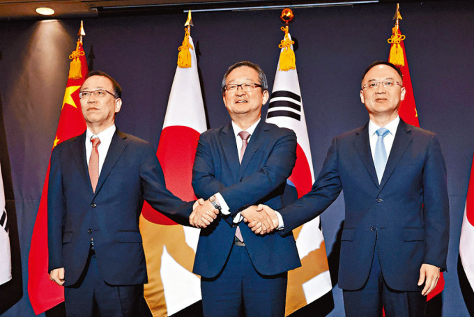傳中日韓峰會爭取年底復辦。圖為外交部部長助理農融(右)早前與日韓官員在首爾開會。