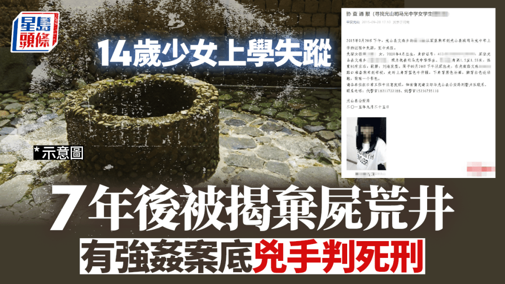 2015年9月,河南省信陽市一名年僅14歲女孩返學中途失蹤。事隔七年後,始發現其屍體,證實被殺。去年,有強姦案底的兇手被捕,內地傳媒報道,近日法院已審結案件,對兇手判處死刑。事件中的女孩終於沉冤得雪。
