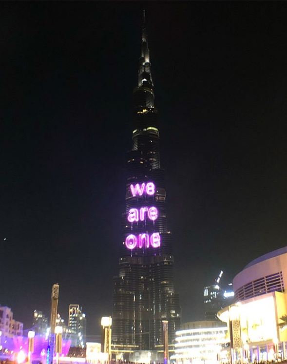 這棟至今世界最高建築的LED外牆,過往只展示過阿聯酋或沙地阿拉伯的王室成員、國旗、重大節日祝福,EXO是首個團體登上這個LED外牆。(網上圖片)