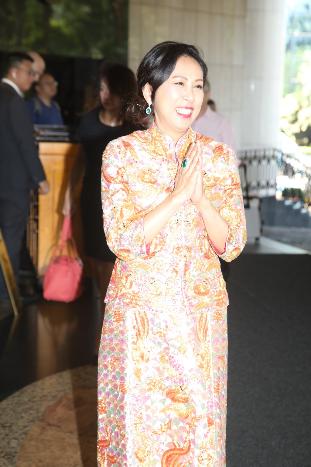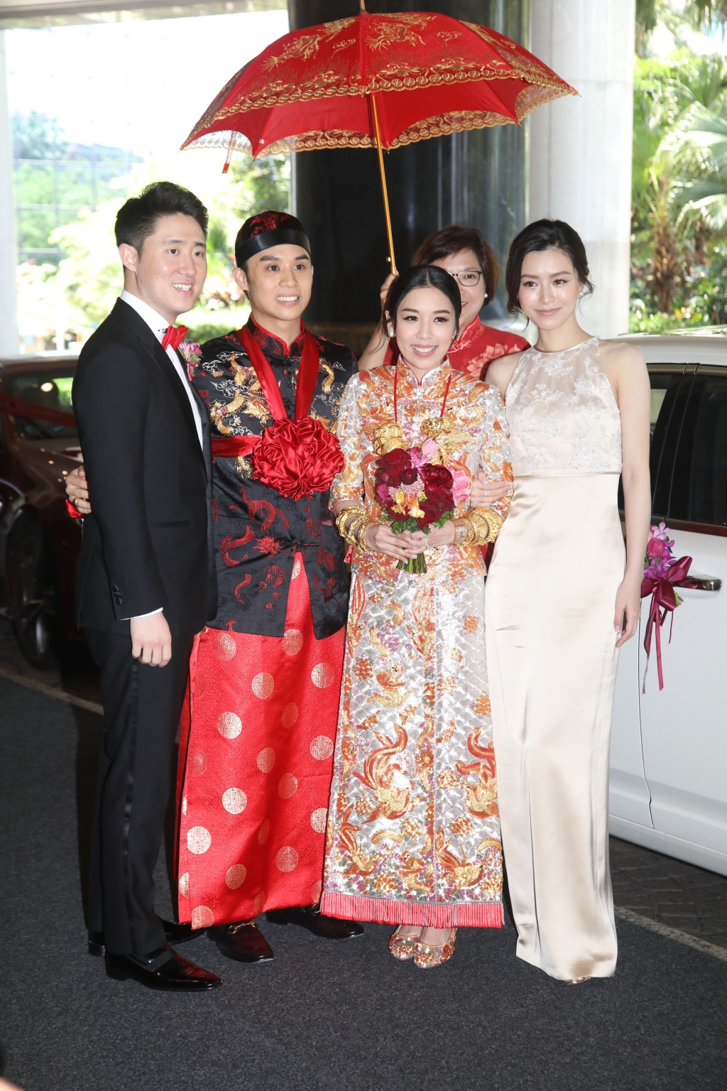 一對新人其後於中午12時許坐花車抵達君悅酒店,擔任伴娘的文詠珊(Janice Man)在場迎接。一對新人穿上傳統中式婚嫁禮服,Jeffrey細心為穿上裙褂的Carmen開車門,二人停步讓傳媒拍照,Carmen一臉燦爛笑容坦言:「好開心!」