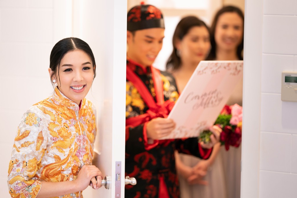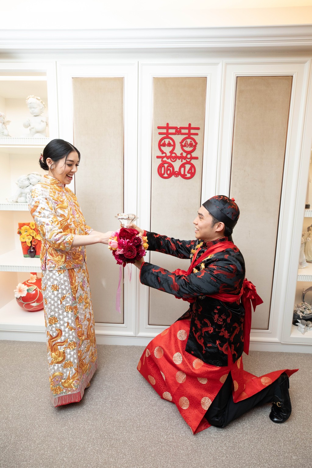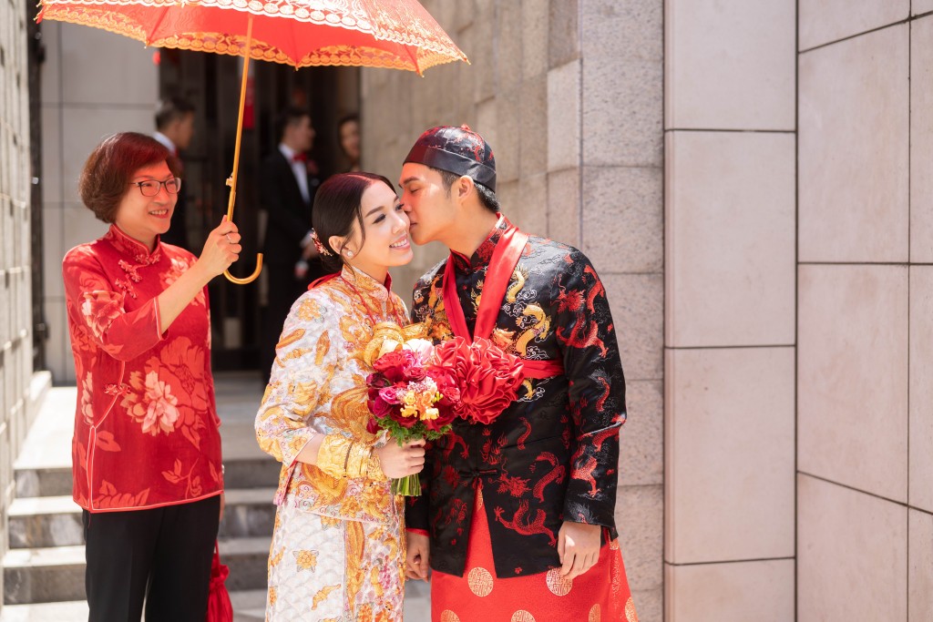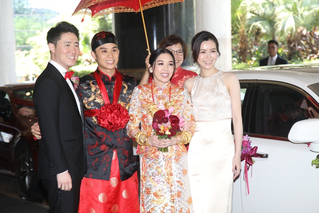 昨晨新娘子Carmen和新郎Jeffrey一早進行傳統的接新娘及斟茶儀式,Jeffrey出動開門利是88888元迎接太太Carmen,意頭十足。姊妹團大玩新郎及兄弟團,要求他們伸手入箱內摸牛蛙、生蠔等,場面搞笑。Jeffrey向太太Carmen宣讀愛的宣言:「時時錫哂您,永遠陪住您!」場面溫馨、感人。