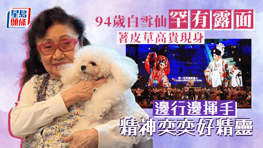早前香港管弦樂團(港樂)與桃花源粵劇工作舍聯合主辦「落花滿天‧ 管弦光影之旅」音樂會兩日連開三場演出,將任白的經典名作以粵劇戲曲與西樂跨界別合作的方式重新演繹。現年94歲的白雪仙近年已罕有公開露面,但演出當日仙姐悉心打扮現身,令全場觀眾為之歡呼。仙姐當晚穿上綠色皮草外套配上長褲,戴上招牌眼鏡,看來精神奕奕,仙姐由前特首林鄭月娥陪同下現身,她邊行邊向現場觀眾揮手,好精靈。