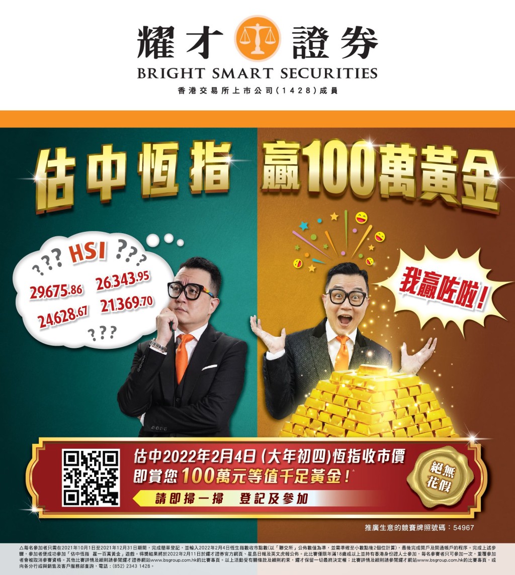 遊戲參加方法如下,2021年 12月31日或之前參加者透過活動登記頁面https://www.bsgroup.com.hk/bsg.web/campaign/HSIGuessingGame_1M.aspx,競猜2022年2月4日(虎年大年初四)的恒生指數收市價(以聯交所公布數值為準,並須準確至小數點後2個位計算),完全估中整個數值的一位參賽者,將贏走等值一百萬港元的千足黃金。(jh)
