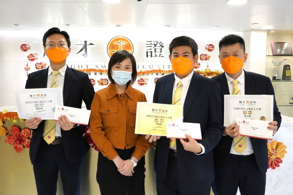耀才為鼓勵各前線員工在前線崗位要全力以赴奪取佳績,故一直都設有前線及分行激勵獎項,向傑出表現的員工及分行頒發奬狀及獎金。「耀才證券2021年前線員工頒獎禮」日前舉行,由主席助理葉頴恩及行政總裁許繹彬代表頒發「全年吸金王」、「全年開戶王」及新春分行布置等多項大獎。