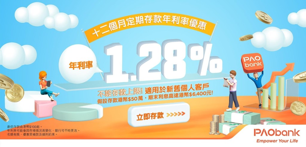 以存款港幣50萬元及敍造12個月定存計算,個人銀行客戶可享利息高達港幣6400元。個人銀行客戶只需透過PAOB手機應用程式,即可全天候開戶並設立定期存款指示。