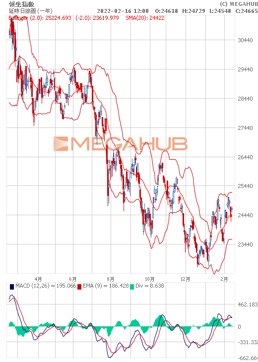恒指陰陽燭暫為陀螺,待變。10天線、20天線和100天線的匯合區失而復得。日線圖技術指標變化不大,MACD熊差幾近消失,並未顯著擴大;慢隨機指數跌離超買區並發出沽貨訊號,9RSI重返中軸之上報55.77。保歷加通道橫行,大市可能轉為上落市,通道頂( 25224)和通道底( 23619)提供阻力和支持。