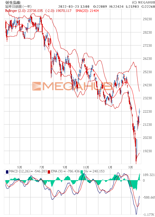 恒指暫以陽燭上升,日線圖技術指標向好,MACD牛差持續擴大,慢隨機指數維持買入訊號,9RSI升至58.53。保歷加通道收縮,大市波幅料會逐漸收窄。