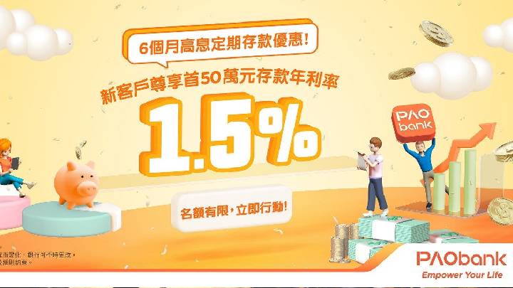 平安壹賬通銀行(PAOB)推出港幣定存優惠,加碼為全新個人客戶帶來高息優惠。由即日起至2022年5月31日,新客戶凡開立6個月港幣定期存款,首50萬元可享額外0.5%年利率,加上現有的6個月港幣定期存款1%存款利率,合共賺1.5%年息。