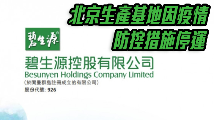 碧生源(00926)公布,根據北京市房山區人民政府關於加強新冠疫情防控措施的要求,集團位於北京市房山區的生產基地已由今年4月28日起暫停營運。目前集團並未獲悉該生產基地恢復營運的確切日期。該生產基地為集團的碧生源牌常潤茶、碧生源牌常菁茶、碧生源牌纖纖茶的生產基地。