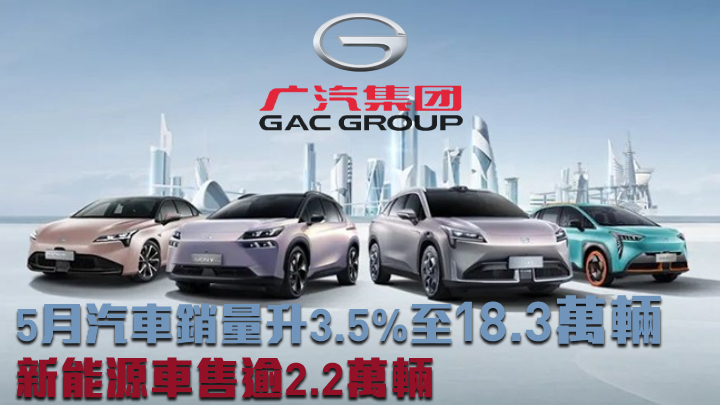 廣汽(02238)公佈,5月汽車銷量為18.3萬輛,按月回升47.3%,按年增長3.54%;其中售出22411輛新能源汽車,按年升1.18倍。今年累計銷量達91.55萬輛車,包括86596輛新能源車,按年分別增長6.4%及1.07倍。