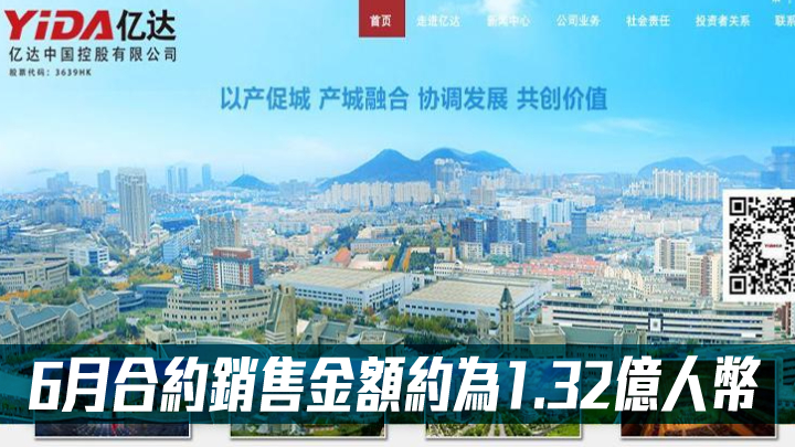 億達中國3639|6月合約銷售金額約為1.32億人幣