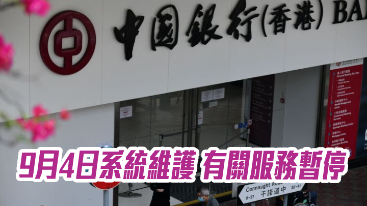中銀香港9月4日系統維護 有關服務暫停
