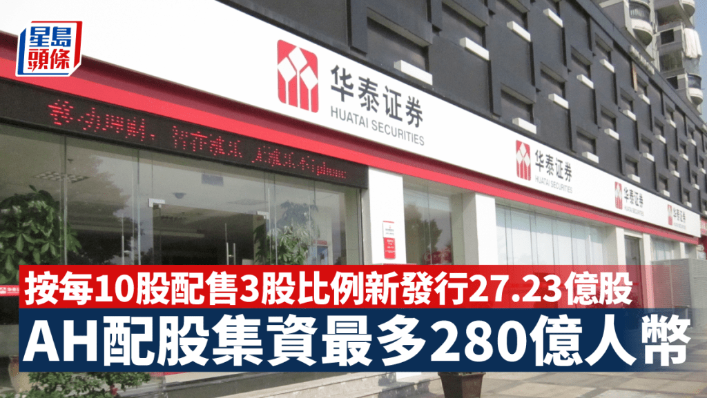華泰證券擬10供3 AH配股集資最多280億人幣 股價齊跌