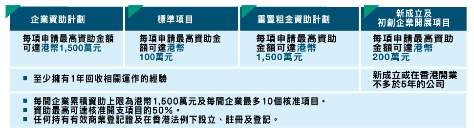 以上兩個個案均透過「企業資助計劃」下的「特邀項目 — 新成立及初創企業開展項目」獲得資助。「企業資助計劃」是資助個別回收相關運作公司,或與回收行業有密切聯繫的機構和組織,以加強廢物收集及處理,提升處理回收物的質量,擴大回收網絡、提升回收效能。申請者額外增聘員工、購買設備及機器,製作和推廣項目成果的費用及由回收業務所產生的租金等都可獲資助。「行業支援計劃」則是資助如工商組織、專業團體及研究機構等非分配利潤組織推出讓回收行業提升運作水平及生產力的非牟利項目。