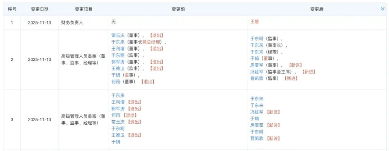 此次調整還涉及多位核心高管,常玉慶、王利增、郭軍濤、王德衛、何雨五位董事退出,新增房亞軍為董事,馮延軍任監事會主席,王慧任財務負責人,菅凱歌任監事。
