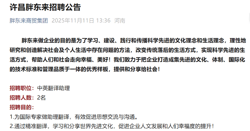 于東來卸任總經理?胖東來招聘翻譯助理年薪逾50萬
