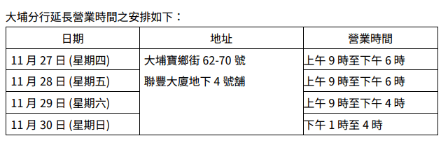 中銀香港已於大埔區4家分行增派人手,並將延長本星期六(11 月29 日)的服務時間至下午5 時,以支援受影響的客戶。4家分行詳情如下︰