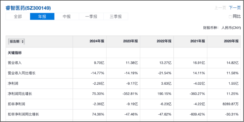 《星島環球網》了解到,2021年睿智醫藥營收近17億元,卻首次出現淨利虧損,此後三年營收規模持續走低,虧損也逐步擴大,2021年至2024年累計虧損22億元。