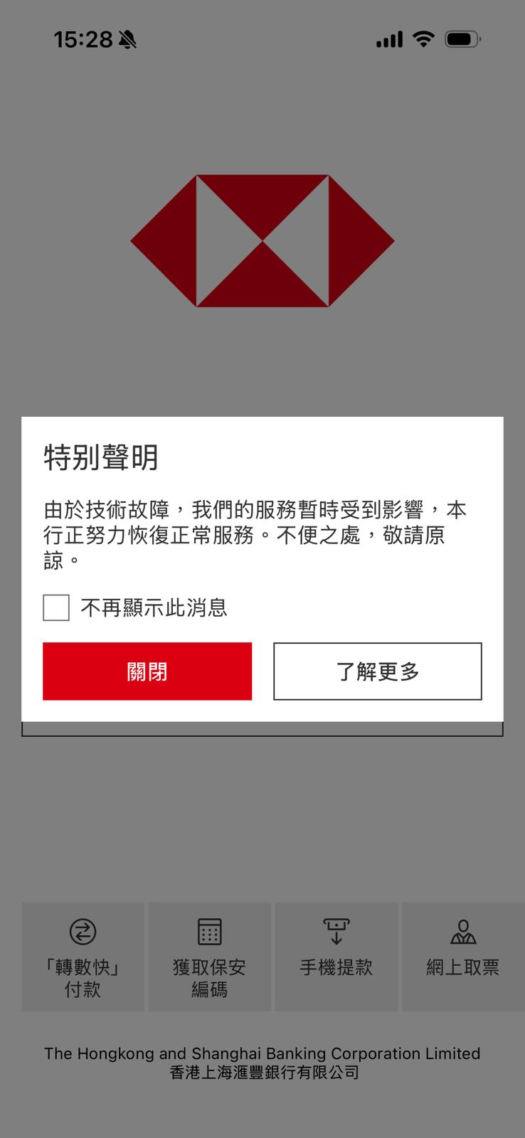 滙豐銀行電腦系統故障,該行網上銀行應用程式無法登入,《星島頭條》記者嘗試登入時,該行應用程式彈出「特別聲明」,指「由於技術故障,我們的服務暫時受到影響,本行正努力恢復正常服務」。