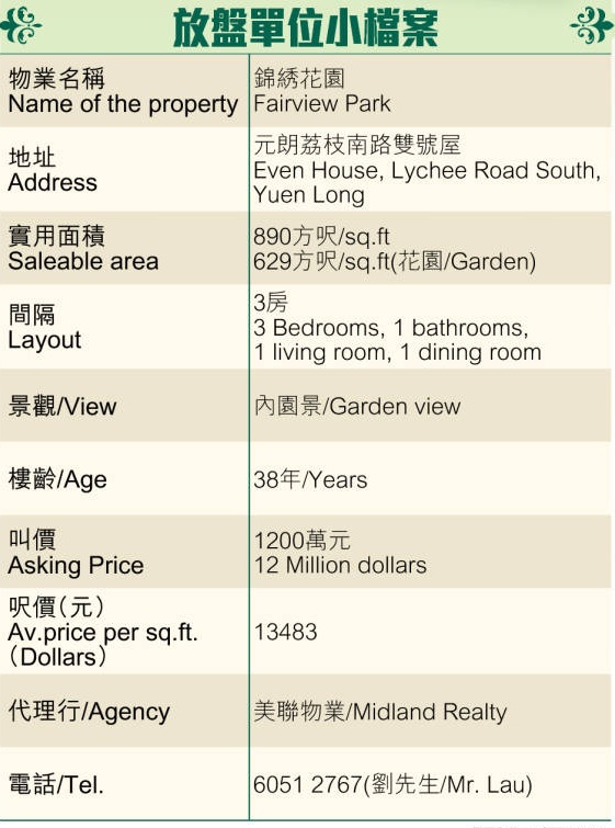 是次走訪錦綉花園荔枝南路雙號屋,洋房樓高2層,洋房設有車庫,可泊2車,而洋房實用面積890方呎,外連629方呎的前後花園,戶主可在此放置戶外桌椅,方便家人在此曬太陽,談話家常。進入洋房內,地下為客飯廳及廚房,廳堂用色以杏色為主,配以木色及黑色家具,溫馨舒適。而洋房上層為3間房,各房空間寬闊,易於擺放及配襯家具,並均設大窗,可增加空氣流通,還可外望自家花園,以及同屋苑樓景。浴室方面,以黑白灰色為主,並置有金框大鏡,方便梳洗。