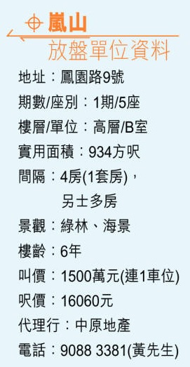大埔嵐山由長實發展,分為2期,分別於2014年和2015年入伙,由8座組成,提供約1350個單位,並設有會所,設施包括健身室、電影院及乒乓球室。以下介紹為1期5座高層B室,為4房1套設計,實用面積934方呎,為市場罕有大戶放盤。