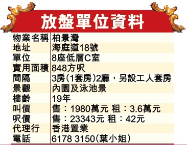 大角嘴柏景灣位處奧海城商場及港鐵奧運站上蓋,出入及購物皆相當便利。是次推介的3房1套放盤,實用面積848方呎,望內園泳池及避風塘一帶海景,最新叫價1980萬,租金回報約2.2厘。睇樓王