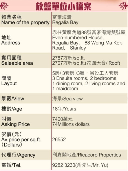 《睇樓王》:赤柱富豪海灣 敞亮海景廳堂