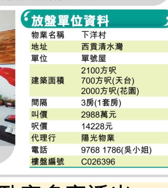 今次精選西貢下洋村全幢村屋放盤,建築面積2100方呎,賣點是2000方呎花園,園內已建有私人泳池,全屋採3房連1套房設計,一室雅緻裝潢,業主現以2988萬放售,建築呎價約14228元。