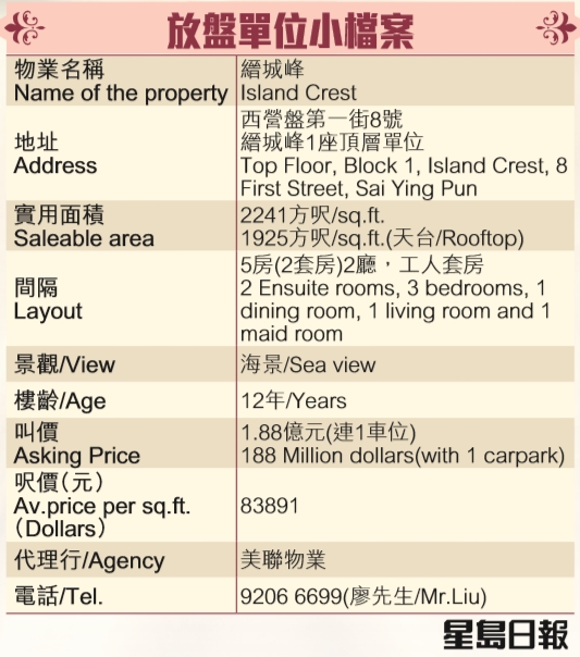 天台備有私家泳池,住客閒時可暢泳。西營盤地標屋苑縉城峰,樓齡約12年,1分鐘步程直達港鐵西營盤站。是次精選該盤頂層單位,實用面積2241方呎,5房2套房設計,賣點是連1925方呎天台,還有私家空中泳池,對正開闊維港海景。大廳天花掛有水晶吊燈,一屋閃爍璀璨。單位可俯瞰西區及對岸九龍站一帶海景。