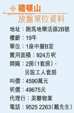 跑馬地豪宅屋苑禮頓山,位置優越,鄰近利舞臺廣場及時代廣場等地標商場。今次精選屋苑的2房1套房單位,實用面積為924方呎,望跑馬地馬場,業主叫價4590萬,實用呎價約49675元。