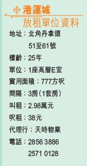 睇樓王|北角港運城 近港鐵3房1套租2.98萬