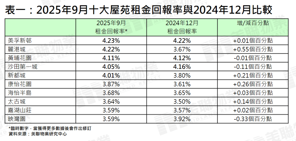 今年首9個月計算,麗港城租金回報率累積升幅約達0.55個百分點,為10大屋苑之冠;鰂魚涌康怡花園及新都城累積升幅亦分別達0.26及0.21個百分點。