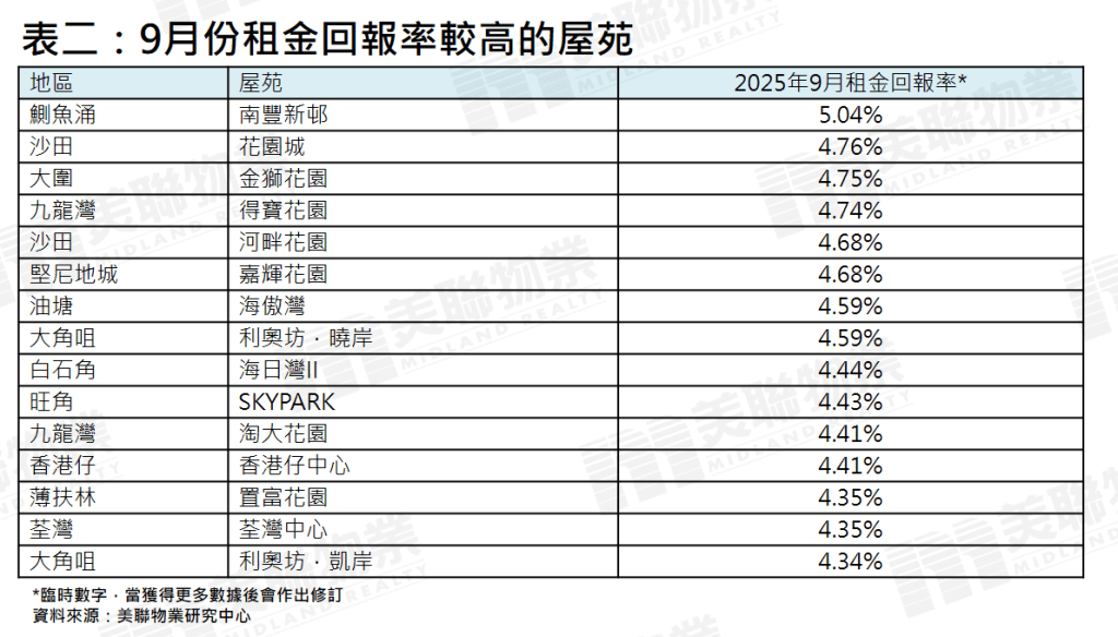 除10大屋苑之外,部分二線屋苑租金回報率更高,其中鰂魚涌南豐新邨錄約5.04厘,沙田花園城、大圍金獅花園及九龍灣得寶花園,租金回報率均超過4.7厘。