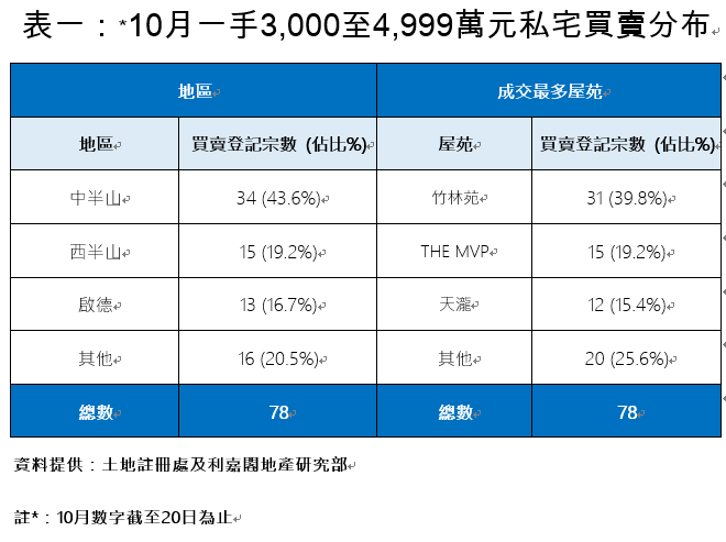 在10月份首20天一手私宅成交中,按地區劃分,以中半山錄34宗佔最多(佔比達43.6%),其次為西半山錄15宗(佔比達19.2%),第三則為啟德錄13宗(佔比達16.7%),三者合計已佔逾79.5%,反映中、西半山及啟德都是豪宅集中地及投資移民樂意追捧地區。