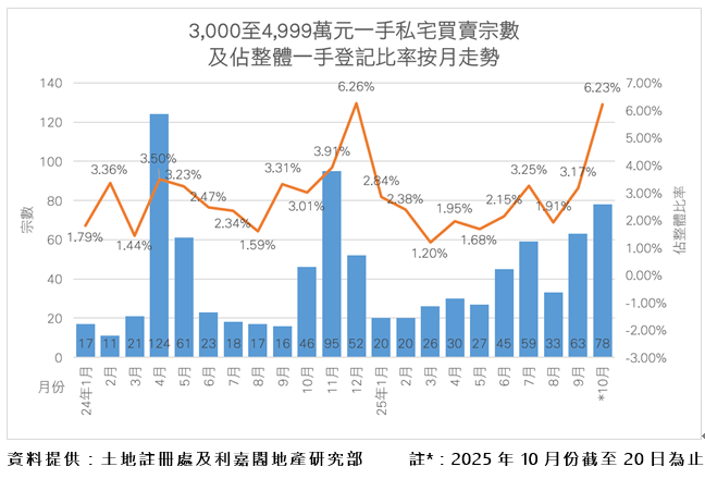 根據土地註冊處數字顯示,10月首20天,樓價介乎3,000萬至4,999萬一手私宅買賣登記共錄得78宗,已超越9月全月的63宗,按月升約24%,而較今年1月低位20宗更激增2.9倍。