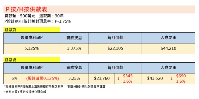 假設貸款額500萬元、年期為30年,減息前,P按息率及H按封頂息率為3.375厘,每月供款為22,105元,入息要求為44,210元。減息後,實際按息下調至3.25厘,每月供款將減少345元至21,760元,入息要求將減少690元至43,520元。
