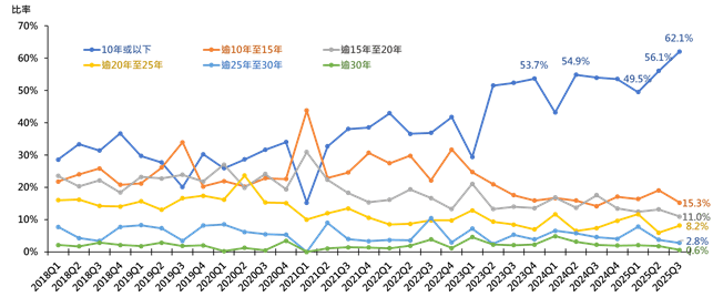 近年新晉屋苑備受用家及投資者青睞,受歡迎程度與日俱增。調查顯示,高達62.1%的受訪者首選樓齡10年或以下的新晉屋苑,比例首次突破6成,創下紀錄新高;其次為樓齡10年以上至15年的物業,佔比達15.3%,而樓齡介乎15年以上至20年的物業亦佔約11%。