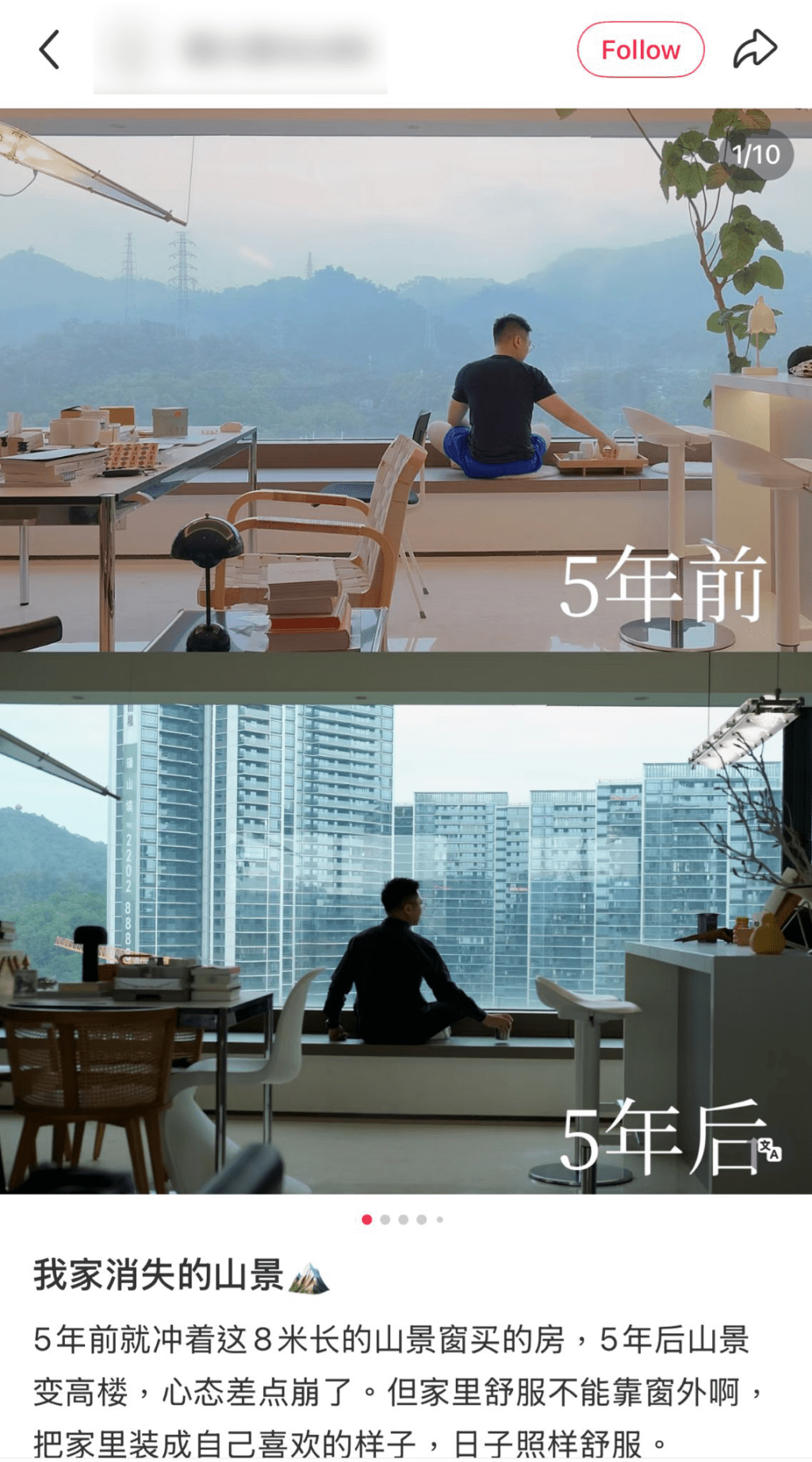 該名內地業主在小紅書上發文表示,5年前購買單位時,看中的是窗外8米寬、綠意盎然的山景,當時覺得開闊、心情愉快。然而5年過後,眼前的山景盡被新落成的高樓遮擋,只剩對面樓的外牆,坦言「心態差點崩了」,但仍試圖樂觀面對。他認為,家居舒適與否不應只靠窗外風景,強調「裝(修)成自己喜歡的樣子,日子照樣過得好。」