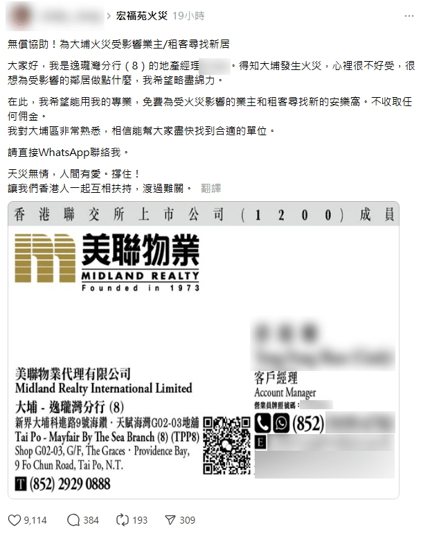根據該地產代理在Threads發布帖文,其為美聯大埔逸瓏灣分行(8)的地產經理,稱可為受火災影響的宏福苑居民尋找新居,強調不收取任何佣金,「得知大埔發生火災,心裡很不好受,很想為受影響的鄰居做點甚麼。」她續指,希望能以其專業,免費為宏福苑業主和租客尋找新的安樂窩,加上自己對大埔區極為熟悉,相信能幫助居民盡快找到合適單位,而帖文亦附上其代理卡片作為聯繫方式。