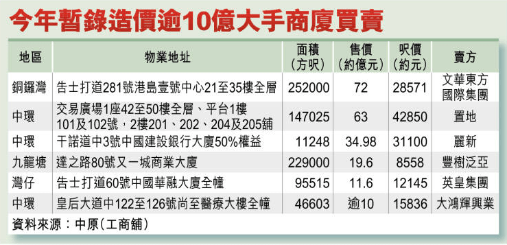 除前述又一城的交易,今年寫字樓交易金額皆十分巨大,置地公司率先在今年4月售出中環交易廣場一期42至50樓寫字樓連平台部分舖位,買家為港交所,物業作為自用,作價63億。