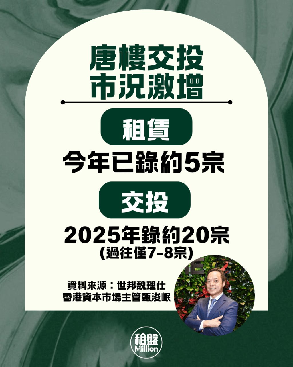 隨着宿舍需求不斷上升,不少投資者收購或租下整幢唐樓,將其改造成學生宿舍。甄浚岷透露,目前唐樓市場的主要買家已從發展商轉向學生宿舍營運商,包括內地企業、金融或地產相關人士。他又指,以往很少投資者會選擇收購整幢唐樓,每年僅有7至8宗成交。但自從內地生視香港為留學首選後,帶來龐大居住需求,間接帶動唐樓整幢交投,數量為之前的3倍,2025年全年世邦魏理仕便錄得逾20幢用於改建學生宿舍的唐樓成交。