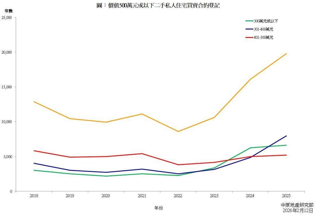 中原研究部高級聯席董事楊明儀表示,政府於2025年2月底發表的《財政預算案》,宣布放寬百印花稅徵收門檻,由原來價值300萬或以下物業,放寬至400萬或以下物業,去年301萬至400萬二手私人住宅最受惠,2025年全年錄7978宗買賣,按年急增63.7%,佔500萬或以下私宅買賣比例,由2024年的30%,增加至去年的40%,按年增加10個百分點。