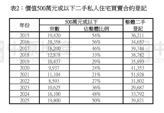 不過,在301萬至400萬上車盤成交增多帶動下,2025年價值500萬或以下二手私人住宅買賣登記錄約19800宗,佔整體買賣登記39821宗約50%,宗數按年增加23%,佔比按年增加2個百分點。樓市自2021年高位調整,市場購買力以上車客為主,再者受全面撤辣、免壓測及放寬按揭成數等措施刺激,買家明顯轉為流向細價樓,以致500萬或以下私宅買賣佔比,由2021年的21%低位,連續4年上升,累積上升29個百分點。