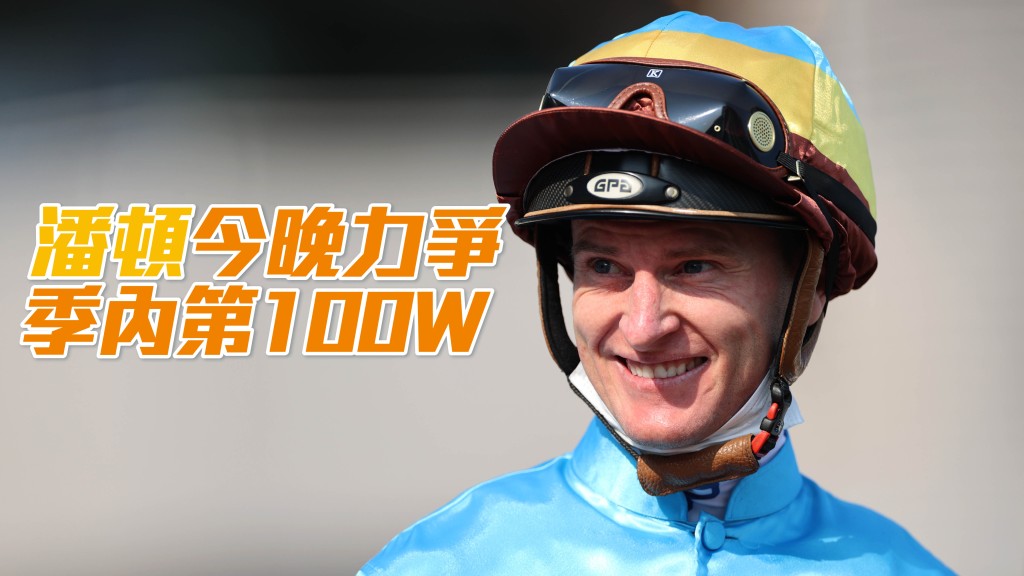 現時高踞騎師榜首位的潘頓在今晚(3月1日星期三)跑馬地夜賽將出足九場,力爭取得今季第一百場頭馬。
