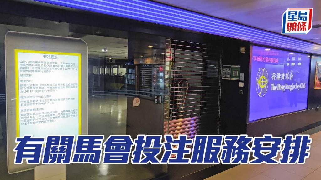 由於香港天文台已於上午10時30分改發紅色暴雨警告信號,並宣佈將於上午11時40分改發三號強風信號,馬會場外投注處*、電話投注服務熱線包括1881、1882和1887、1886電話投注自動服務,以及顧客服務熱線包括1818、1817和1880將於八號烈風或暴風信號取消後的兩小時後恢復服務。