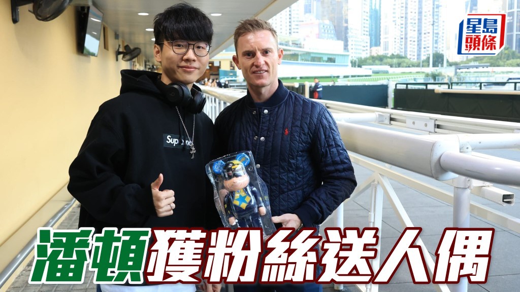 今日下午未夠五時半,一位潘頓的男粉絲已到馬場守候,表示要為偶像送上人偶,以祝賀他憑「金鑽貴人」勝出國際賽,而人偶的心口印上該駒綵衣的圖案,設計非常有心思。潘頓收到禮物喜悅萬分,高興地與粉絲合照留念。