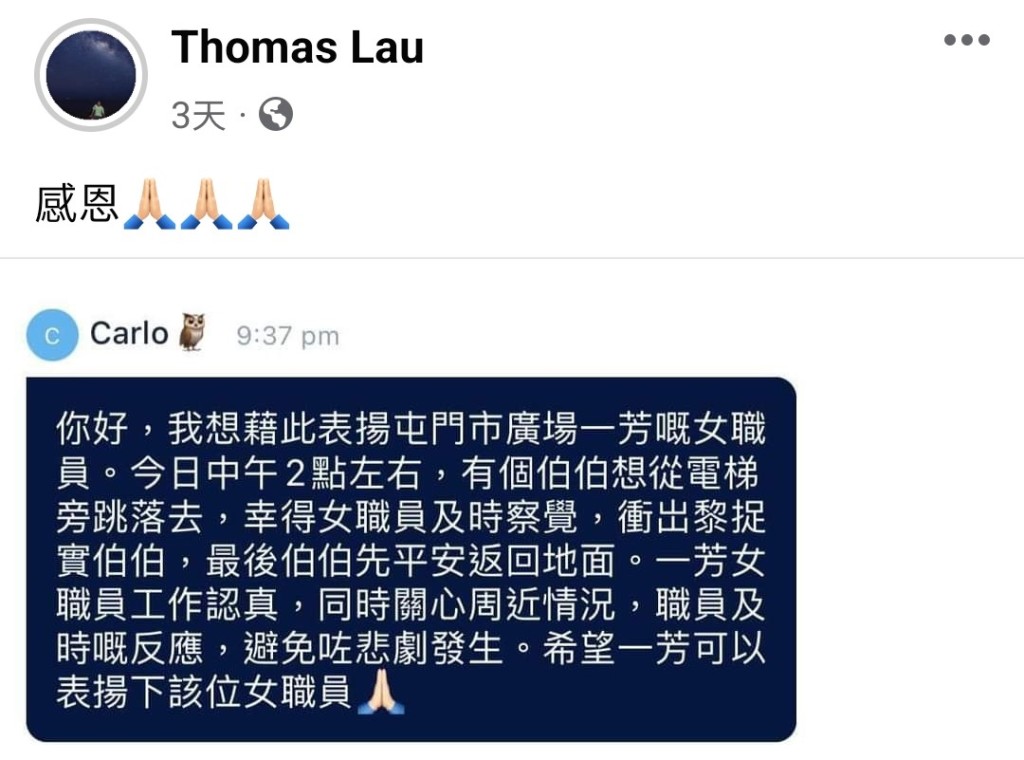 該訊息內容是早前在屯門市廣場,有位伯伯想從電梯跳落去,幸得劉心暉旗下的茶店女職員及時察覺,衝出來捉實伯伯,最後伯伯平安返回地面,避免悲劇發生。