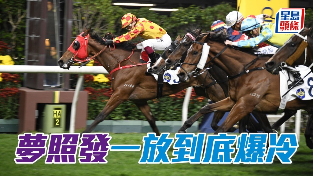 沈集成馬房的「夢照發」,雖然曾在抵港後十二個月沒有上陣,但今季復岀後狀態冒起甚速,上場在田草二千米走入冷位後,今晚轉戰谷草二千二百米,即由巴度策騎一放到底,爆岀十八倍冷門贏馬。