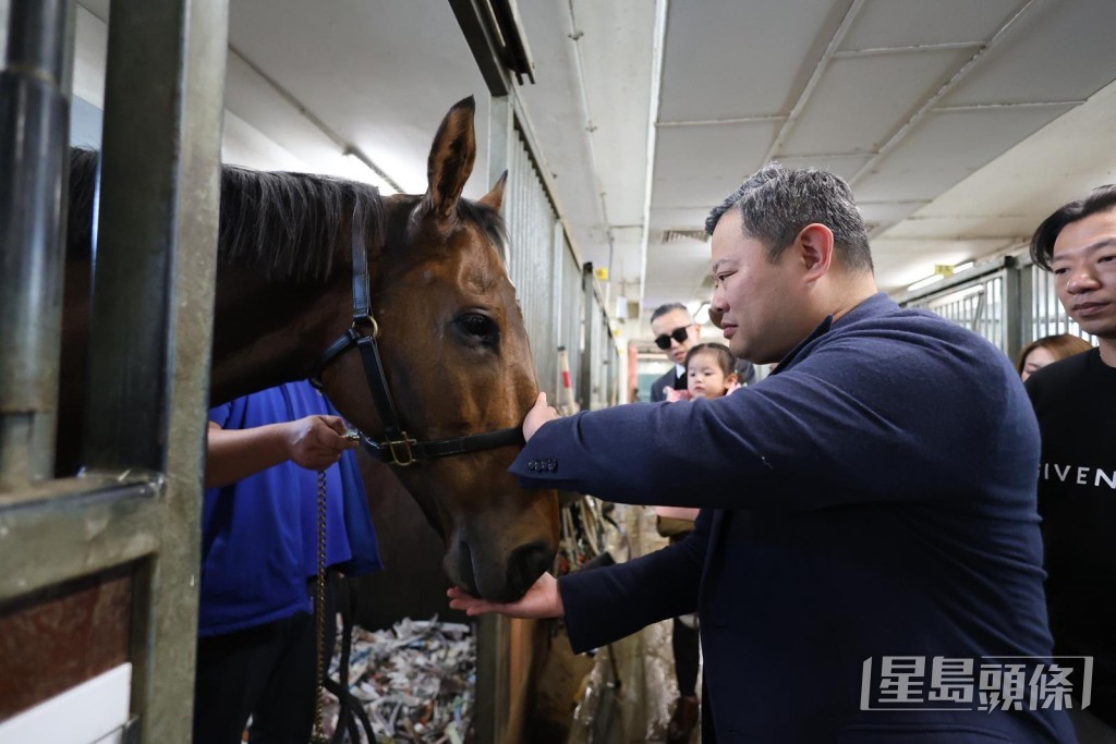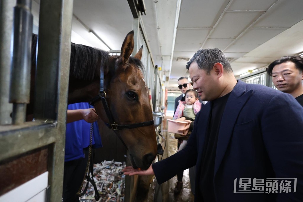 昨日「遨遊氣泡」成功衛冕香港一哩錦標,馬主程俊華今日入馬房探望牠,並親自餵愛駒食紅蘿蔔以示獎勵。之後程俊華亦探望另一同由姚本輝訓練的「遨遊首領」,後駒暫時在港尚未出賽。