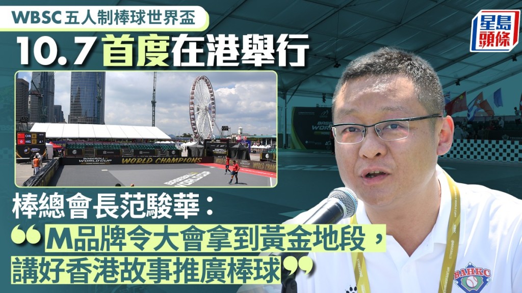 2024年WBSC五人制棒球世界盃,由周一起至周六一連6日在香港盛大舉行,衛冕球隊古巴將和中國、港隊合共12隊競逐世界冠軍的殊榮,賽事更會透過網上串流平台向全球廣播。中國香港棒球總會會長范駿華表示,要感謝政府頒發M品牌認可予今次五人棒球世界盃,令到大會可以拿到中環海濱的黃金地段舉辦比賽,向全世界講好香港故事,推廣棒球運動發展。